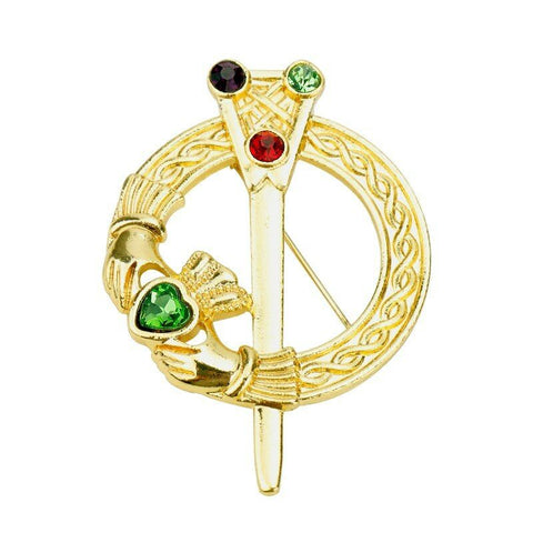 Gold Colored Alloy Claddagh Heart Brooch with Crystals 1.5 in x 2.5 in
