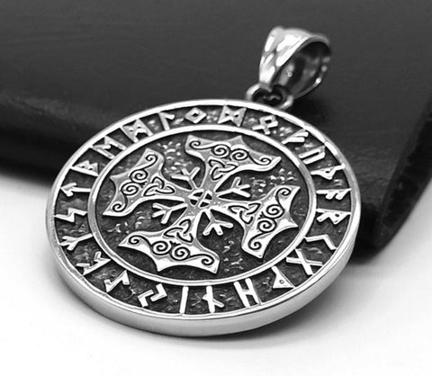 Runes go around the pendant .Cross is four Thor's hammer. Trinity Symbol on each hammer.