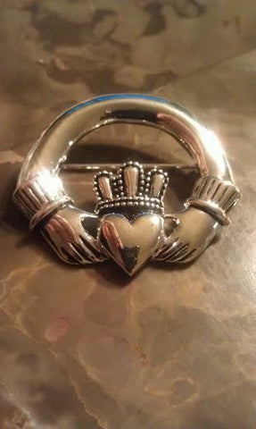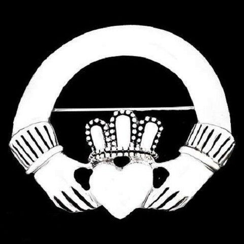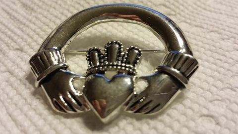 This dramatic brooch will have heads turning! This Pewter Bold Claddagh Brooch offers the look of a high-end piece of jewelry. Highly polished silver over the pewter lends a beautiful shine, and the Claddagh symbol stands on its own for a very dramatic statement. Makes a great scarf pin! Other details of the pewter bold Claddagh brooch include: