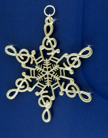This blend of music notes, treble clefs, and a snowflake makes a great tree ornament but has other uses as well. Hang it on your wall as a decoration, wear it as a large pendant, attach a prism and hang as a suncatcher, or let your imagination be your guide. This design will make a great gift for the music lovers. The ornament is made of silver over pewter and the design is 3-1/2" high.