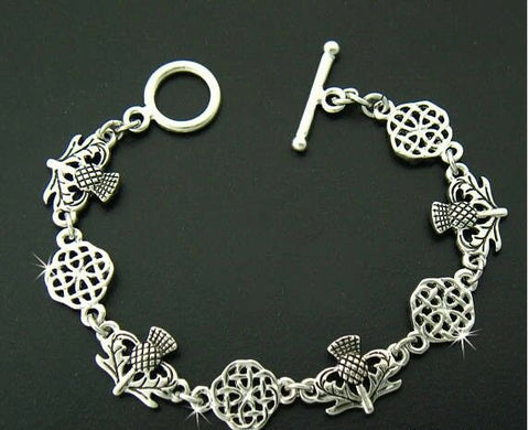 A combination of Scottish Thistles and love knots are set off by a Toggle clasp. Measures about 7.5"
