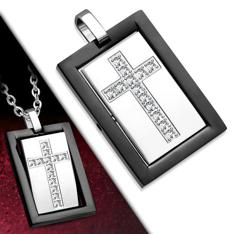 Stainless Steel 2-tone  Cross Tag Charm Spinning Pendant w/ Clear CZ