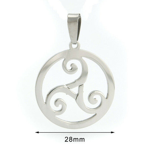 Stainless steel 28 mm diameter Celtic Triskele pendant on 60 cm (23.6 in) stainless steel chain 2.4mm width.